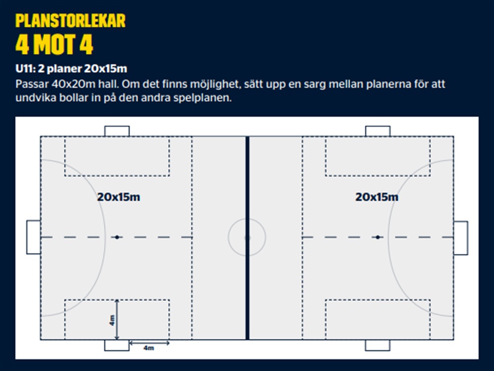 Futsal i den här åldern spelas i en sporthall, med skor lämpade för inomhussport (alltså INTE fotbollsskor) och 4v4 på en liten plan med en målvakt och tre utespelare.